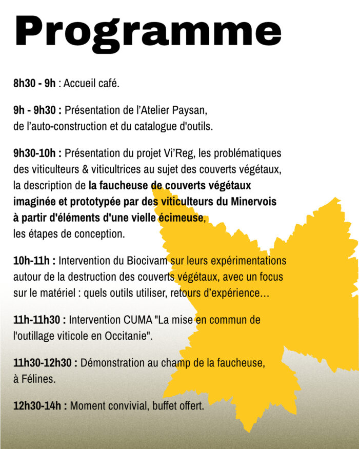 Le 𝗺𝗮𝗿𝗱𝗶 𝟭𝟰 𝗮𝘃𝗿𝗶𝗹 𝗽𝗿𝗼𝗰𝗵𝗮𝗶𝗻, à Rieux-Minervois, venez découvrir une 𝗳𝗮𝘂𝗰𝗵𝗲𝘂𝘀𝗲 𝗱𝗲 𝗰𝗼𝘂𝘃𝗲𝗿𝘁𝘀 𝘃𝗲́𝗴𝗲́𝘁𝗮𝘂𝘅, prototypée par un groupe de viticulteurs à partir d’une vieille écimeuse qui dormait dans les ronce